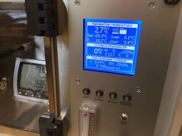 The calibrator reproduces the unit of relative gas humidity in the range from 4 to 96% and meets the requirements for working standards of the 2nd category; it is structurally a monoblock with carrying handles, in which a wet gas generator is located, a rectangular working chamber with a volume of 8.3 liters, controls.