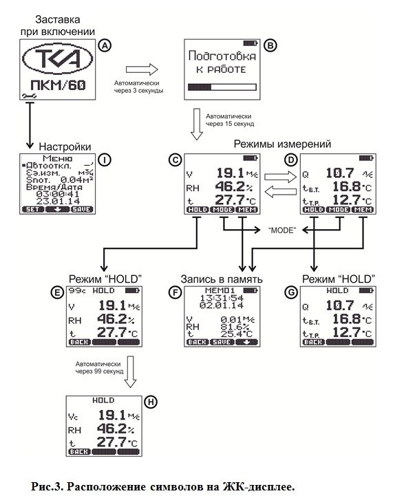 - Nine data cells are organized in the memory of the device. One cell stores the values of air velocity and volumetric flow rate, as well as time stamps to the stored data.