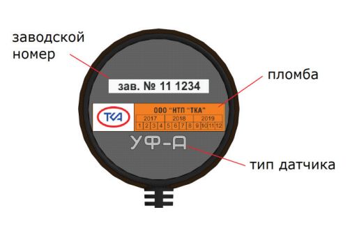 Конструктивно датчик выполнен в виде единого блока с кабелем для осуществления подключения питания и обмена данными. Принцип работы датчика заключается в преобразовании фотоприёмным устройством оптического излучения в электрический сигнал с последующей передачей результата измерения по проводному интерфейсу в виде цифрового кода. В корпусе датчика по диаметру сделана проточка шириной 2,4 мм для крепления датчика на штативное крепление (опция) или на оснастке, имеющейся у потребителя. Для работы датчика подключение может производиться к Блоку обработки информации (ЮСУК.10.0002 БОИ «ТКА-УФД», поставляется отдельно) или любому устройству, имеющему соответствующие характеристики. Обмен данными производится по протоколу UART. Параметры подключения: