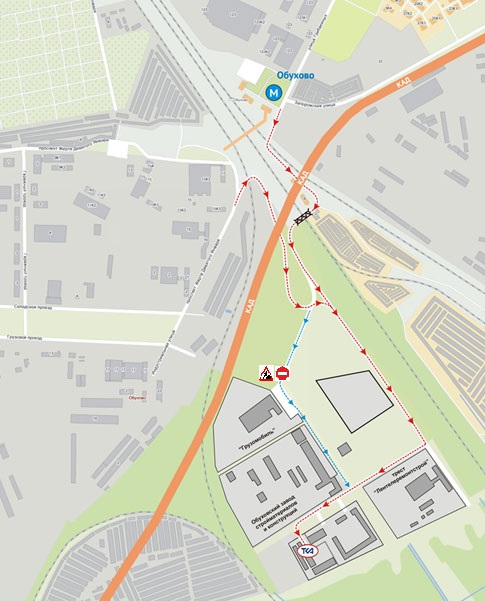 Обращаем ваше внимание: передвижение на автотранспорте через 2-ой Обуховский проезд закрыто (синяя направляющая), пешеходное передвижение также значительно затруднено из-за перекрытий и строительного мусора. Ведутся строительные работы.