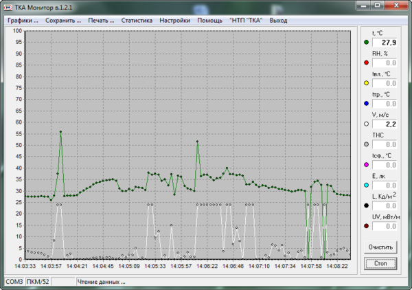Оснащение интерфейса USB позволяет: расширить возможности прибора без ущерба для времени снятия информации, отказаться от бумажных носителей во время считывания параметров микроклимата.